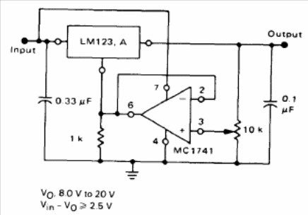 The LM123 series (223 and 333) is manufactured by several semiconductor companies. The circuit below uses the 741 and provides up to 3 A of output. The circuit is from the Motorola's 1990 Linear Databook.