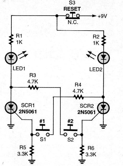 This speed or priority switch set uses two LED indicators and two SCRs in a common configuration. The circuit can work with a battery or source. We found this configuration in an American publication from the 90s.