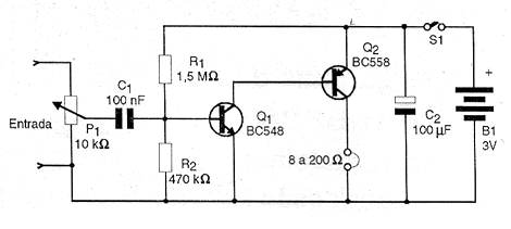 We can use this amplifier with low impedance headphones with good performance. Possible applications for this circuit range from signal followers and experimental radios to a simple stethoscope. The resistors are 1/8W and the power can be done with just two small batteries.