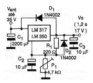 In this block we have a configuration of the most common ones in which some additional elements, which do not always appear in the basic circuits, are aggregated. The circuit shown in the figure can use both the LM317 and the LM350. For LM317 the maximum current is 1.5 A and for LM350, the maximum current is 3 A. In both cases, the integrated circuit must be mounted on a good heat radiator. The diodes serve as protection against the transients caused by the capacitor discharge, while the capacitors decouple and filter. Potentiometer P1 does not need to be highly dissipating, as the current at the reference terminal of the integrated circuit is low. The input voltage must be between 2 V above the maximum output voltage and 35 V.