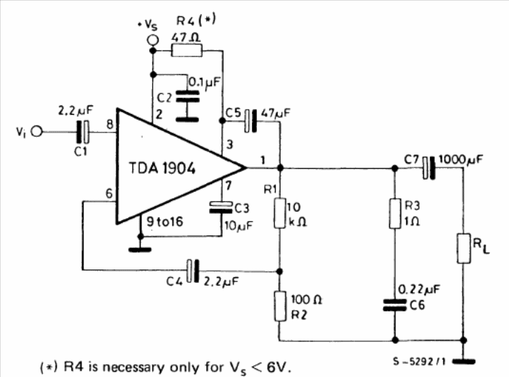The supply voltage range of this circuit ranges from 4 to 20 V and the power depends on the chosen value and the load impedance. The gain is 40 dB, and the suggested load is 4 ohms. The circuit is from the 1982 SGS linear integrated circuit manual. The integrated circuit used is not common today.