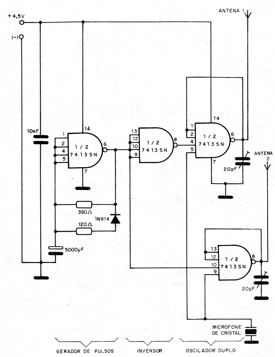 In the absence of a modulation signal, the carrier of this simple short-range transmitter is cut off. The circuit does not use coils and therefore its emission spectrum contains many harmonics. The signal can be picked up on a medium, short wave or even FM radio. We found this circuit in a 1993 documentation.