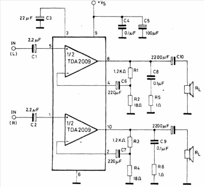 The supply of this circuit can be done with voltages from 8 to 28 V and the maximum output current is 3 A. The gain is 36 dB. The speaker impedance is 4 ohms.