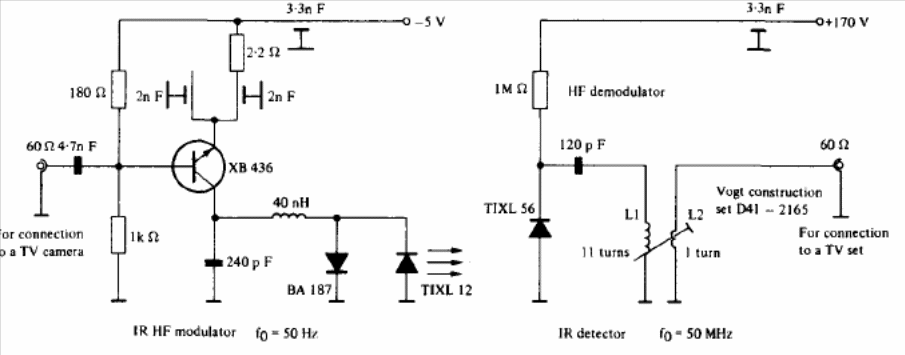 The circuits shown in the figure, that of an infrared video signal transmitter and receiver, were found in a Texas Instruments optoelectronics manual. Optical features, such as lenses, should be used to achieve greater range.