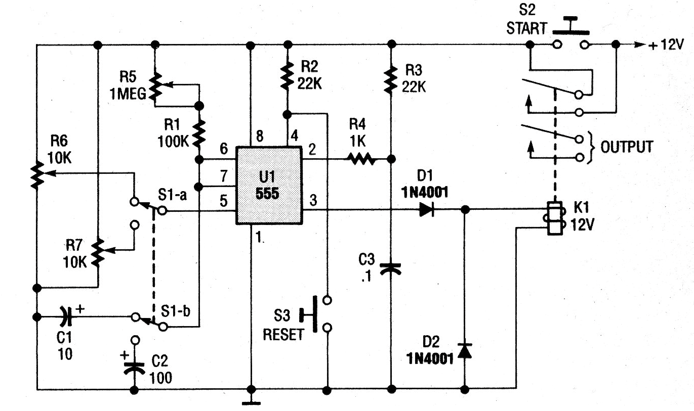 The circuit below is a two-band timer that directly triggers a sensitive relay (less than 20 mA reed relay). The circuit can be powered with 6 or 12 V depending on the relay and longer times can be achieved with changes in C1 and C2. We found the circuit in a 1993 Poptronics.