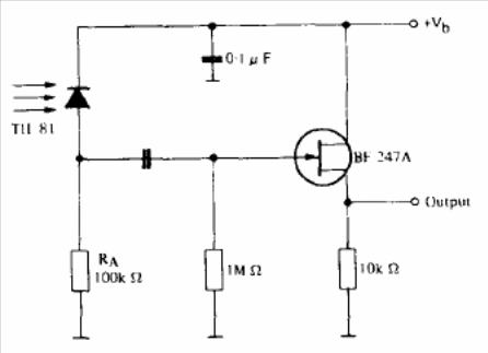 The circuit is from the Texas Instruments optoelectronics manual. The capacitor depends on the frequency of the received signal and the power can typically be between 15 and 25 V.