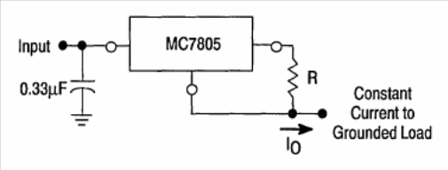 This circuit is the conventional use of the 7805 as a constant current source up to 1 A. The circuit is from Motorola's 1993 Linear Interface ICs. The formula allows calculating the resistor for the desired current.
