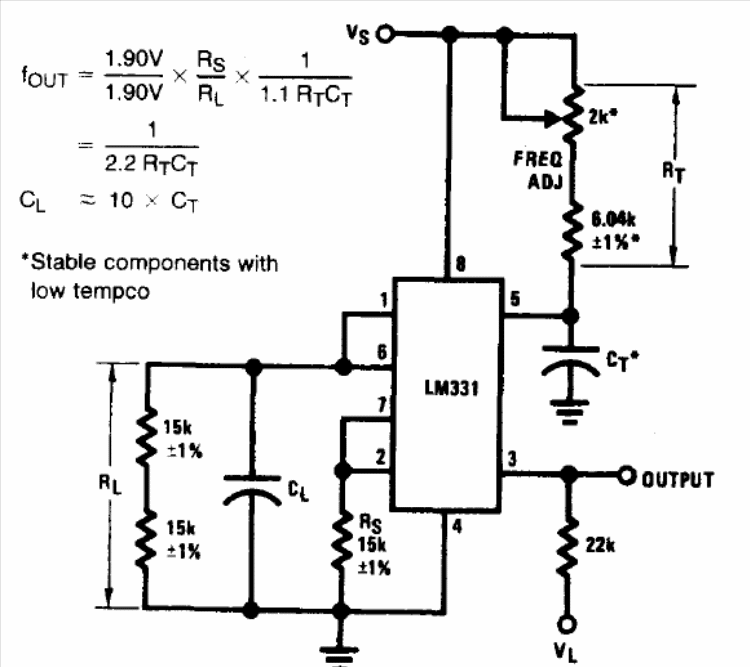 In the figure we have the way to use an LM331 as a stable voltage-adjusted oscillator. The formulas next to the diagram make it possible to calculate the generated frequency. The circuit is from National Semiconductor's Linear Applications Handbook.