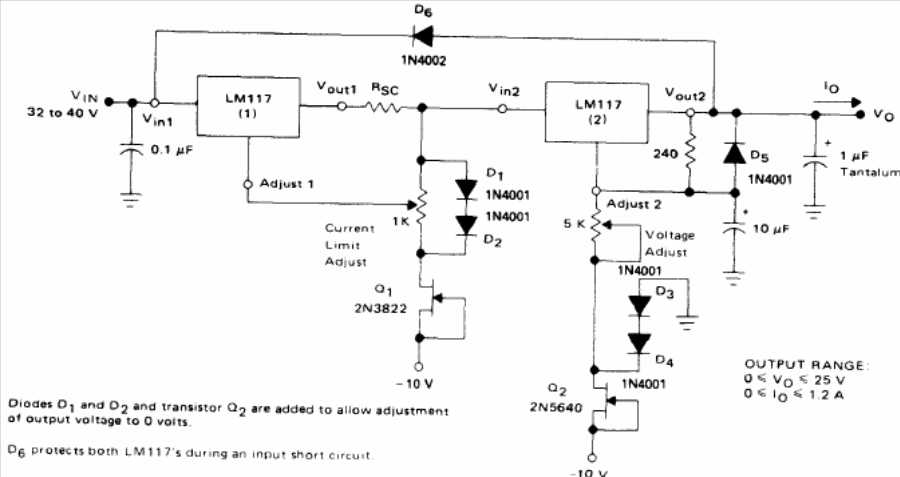 The LM117 (217 and 317) provides 1.2 A with output up to 25 V and is manufactured by several semiconductor industries. The circuit shown is from Motorola's 1990 Linear Databook, serving as an excellent quality laboratory source. The circuit has current adjustment.