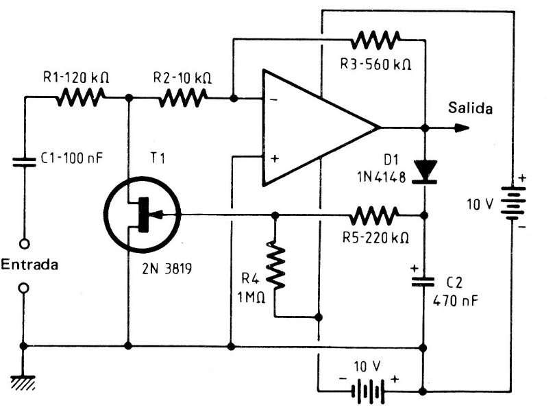 This circuit can use almost any operational amplifier and the FET can be the BF245. The circuit requires a symmetrical power source that can be changed according to the operational amplifier. We found this configuration in a French documentation from 1982.