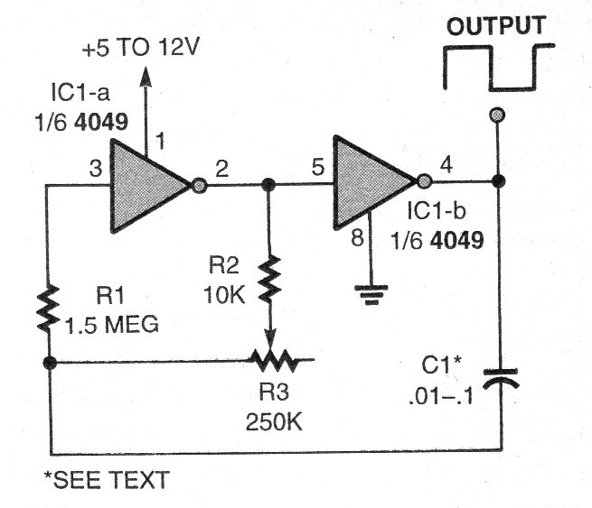 This traditional rectangular oscillator configuration generates signals up to a few megahertz depending on the capacitor. The circuit can be powered by voltages from 5 to 12 V. We found the circuit in a publication from the 90s.