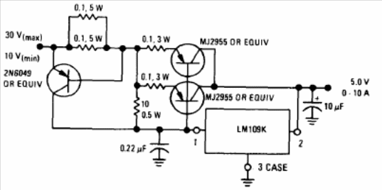 The LM109 can be found with different origins. The circuit shown specifically is from Motorola's Linear Databook but appears in other Databook. Both the transistors and the integrated circuit must be mounted on heat radiators.
