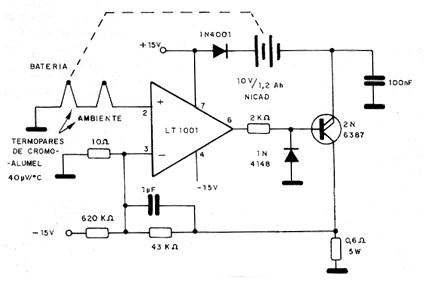 The charging current of this circuit is controlled by the temperature of the accumulators, which is important to guarantee its integrity and extend its useful life. The sensors are thermocouples with the characteristics indicated in the diagram. Nicad's battery is 10 V with 1.2Ah, but changes in the components can be made to charge batteries with other characteristics. The power supply is symmetrical at 15 + 15 V, but the positive branch of the power supply (+15 V) is that it must have a higher current capacity, as it supplies the battery charge.