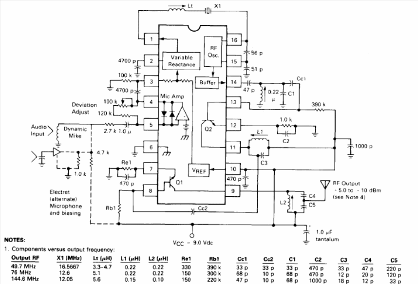 We found this transmitter circuit with a single chip in the Motorola Linear Databook of 1990. The circuit is powered by a 9 V battery and the crystal must be in accordance with the transmitted frequency. Details of the coils are given next to the diagram.