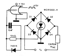 Many readers may not know MOS-SCR yet. It is a SCR in which the input is equivalent to the gate of a MOS field effect transistor, that is, it has a high impedance. The other features, such as trigger voltage and maximum controlled current, are the same as the MCR106 or TICl06, for Motorola MCR1000-4. In fact, the -4 indicates that the maximum voltage between cathode and anode for this SCR in the non-conduction condition is 200 V. In the figure we have a way to use this SCR in a full wave control for the power grid from the output of a CMOS logic circuit, such as a 4001 gate. Of course, depending on the current controlled, the SCR needs to be mounted on a heat radiator. Likewise, the diodes that form the bridge for full wave conduction must be able to handle the voltage and current of the load.
