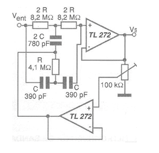 In the figure we have an interesting configuration that allows, from a double T filter, to change the Q factor through a reference voltage given by a second operational amplifier. The circuit is suggested by Texas Instruments in its Linear Circuits Applications, using an operational amplifier with FET at the input. Note that the components of the double T must maintain a determined relationship of values. For the circuit values, the frequency that the filter rejects is 50 Hz. Of course, these values can be changed for operation at other frequencies. A suggested use is to modify the values of the components to tune to 60 Hz and with that the circuit can be used as an efficient noise rejector of the power grid. Operational is the Texas Instruments TL272 which uses field effect transistors at the input and the power supply must be symmetrical. The adjustment of the Q factor is done in the trimpot.