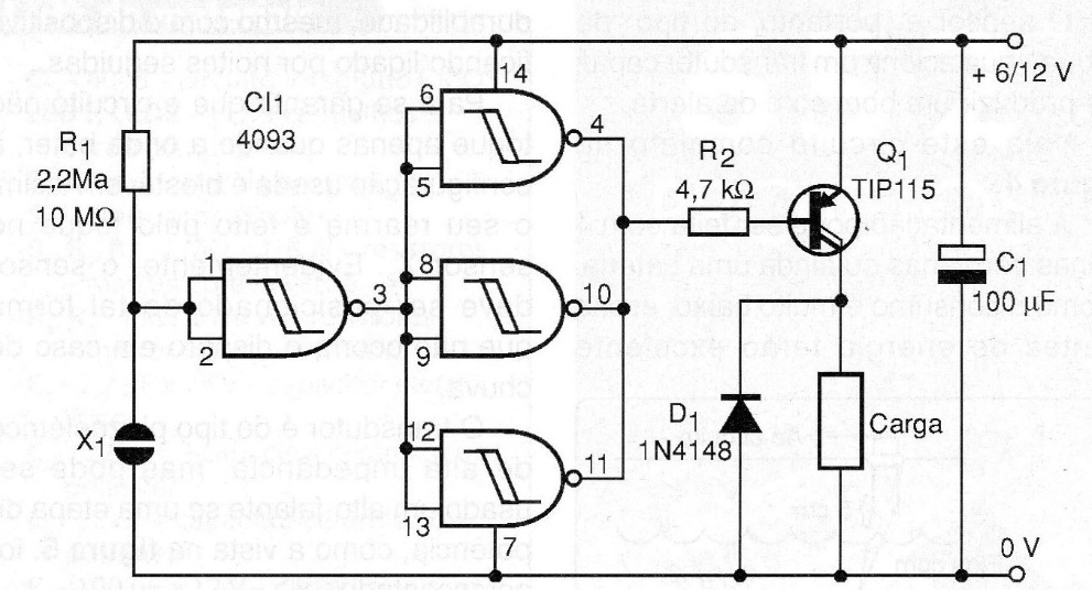 In the figure we show our first circuit that consists of a simple touch switch capable of driving a relay or other loads with currents up to 1 A, in the case of the transistor used. Higher current equivalent transistors can be used to achieve control of larger loads. When the sensor is touched, the output of the first port goes to the high level and with that the next ports, connected in parallel, receiving this signal, have their output going to the low level. The low level is applied to the base of the transistor which then saturates feeding the load. Note that the circuit remains active only for as long as the sensor is touched. When the fingers are removed from the sensor, the charge is immediately deactivated. The circuit can operate with voltages from 5 to 12 V, depending only on the load to be supplied. Resistor R1 determines the sensitivity to touch. For the sensor use two metal plates 1 mm apart so that they can be touched simultaneously and do not use wires longer than 1 m for their connection to the circuit. The transistor must be mounted on a heat radiator if the load current is greater than 200 mA.