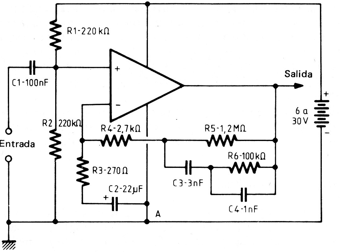 Common operational amplifiers like the TL series, CA3140 and others can be used in this circuit obtained in a French documentation from 1982. The power source does not need to be symmetrical and the approximate gain is 50 dB.