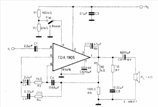 This circuit has a two-position tone control providing a power that reaches 5 W. The supply voltage can be between 9 and 30 V. The circuit is from the 1982 SGS linear integrated circuits manual.
