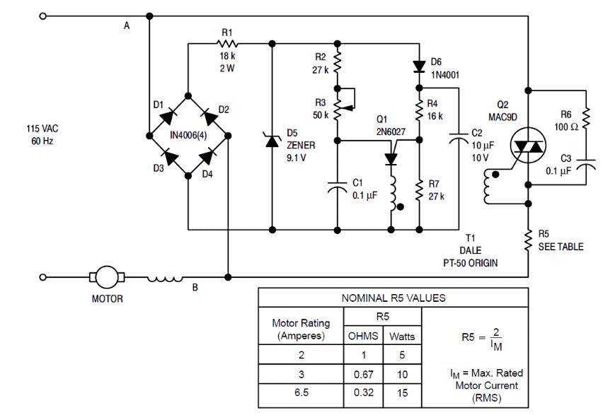 This circuit uses a triac and a PUT to control motors with currents up to 6.5 A. The circuit is from an On Semiconductor thyristor manual and the Triac admits equivalent according to the motor power. The transformer is pulse type with a 1: 1 turn ratio. The Triac must be equipped with a heat sink.