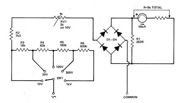 This circuit measures alternating voltages on 5 scales and its accuracy depends on the tolerance of the resistors. The diodes must be germanium. The circuit was found in 1979 English documentation.