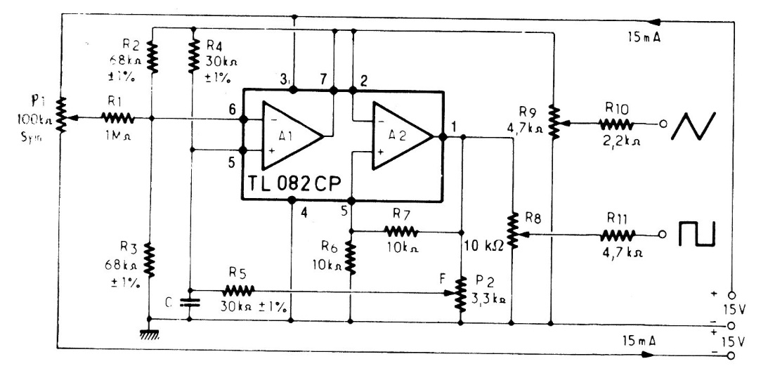 This circuit was found in a French documentation from the 80's. The circuit must be powered by a symmetrical source and the generated frequency range reaches 1 MHz. For 3 to 30 Hz use 1 uF and for 3 to 30 kHz use 1 nF.