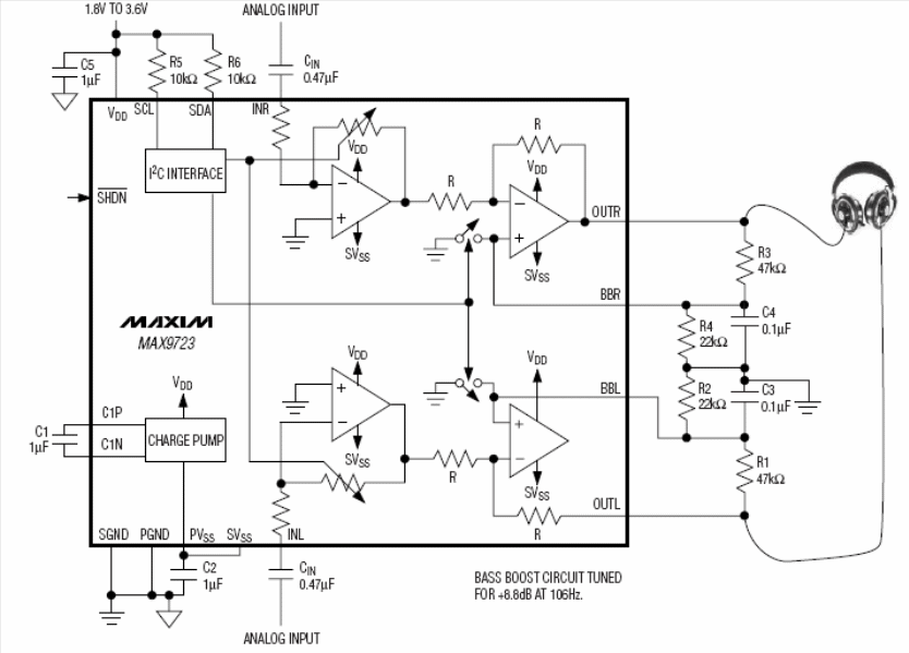 The circuit shown in the figure consists of an amplifier for stereo sources with Maxim's MAX9723 DirectDrive circuit (www.maxim-is.com) capable of providing a 62mW output with power voltages from 1.8 V to 3.6 V The device has volume control and Bass Booster, which makes it ideal for portable sound applications with high quality. The indicated power is for a load of 16 ohms and the harmonic distortion plus noise is only 0.006% with a PSRR of 90 dB. The BassMax feature improves the bass response, thus providing better performance with the use of low-cost headphones. The consumption is only 3.7 mA with 1.8 V power supply and there is also protection against short circuit and thermal protection. In shut-down mode consumption drops to 5 uA and the integrated digital volume control has 32 steps. The MAX9723 can be found in a 16-pin UCSP enclosure or a 16-pin Thin QFN enclosure. More information about the presented configuration can be obtained in the component's datasheet, available for download on the Maxim website. Applications for this circuit include MP3 players, headphones in general, Mini-Disc players and PDA Audio.