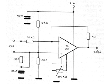 This circuit is an application for an operational amplifier with field effect transistors from Texas Instruments and is intended for the amplification of low frequency signals (audio) with excellent performance. The 1M resistor together with the 10k input resistors determines the gain while the impedance is 50 ohms. The trimpot adjusts the symmetry of the signal, acting on the output offset voltage. The supply can be done with voltages from 1.5 to 12 V.