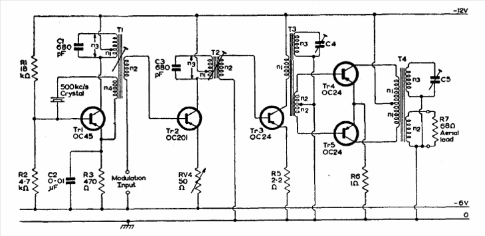 The coils of this circuit will determine the transmission frequency of this device. The circuit is from the 1960 Mullard transistor reference manual and makes use of germanium transistors.