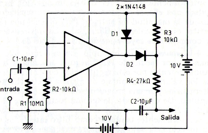 This circuit can use almost any operating system and has a high input impedance. The power supply must be symmetrical. The circuit was obtained in documentation from the 1980s.