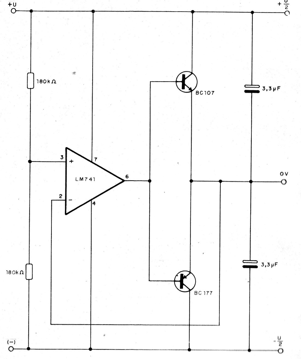 With this circuit it is possible to have a symmetrical source from a simple source with voltages from 6 to 15 V. The circuit divides the voltage of the simple source by 2 and, with the indicated transistors, the maximum output current is 100 mA. For the pair BD135 and BD136, this current can reach 500 mA.