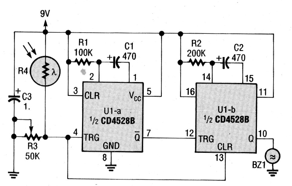 This circuit triggers a low consumption buzzer when the LDR remains illuminated for more than the time given by R1 and C2. The circuit uses an LDR as a sensor and its sensitivity is set to R3. We found this configuration, which serves as a refrigerator alarm in a 1992 Poptronics.