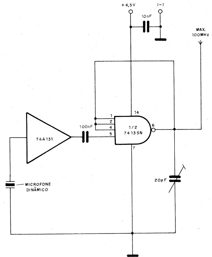 The TAA131 used in this circuit is not very easy to find today, but an equivalent low power audio amplifier can be used instead. The transmitter does not use coils, has a short range and its very precarious tuning range is very wide with the emission of many harmonics. This is an experimental circuit.