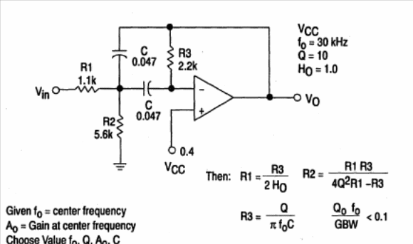 This circuit can also use other series operational amplifiers such as MC33172, MC33174, MC35171, BMC35172 and MC36174. The circuit is from Motorola's 1993 Linear Interface ICs. The formulas make it possible to calculate components according to frequency.