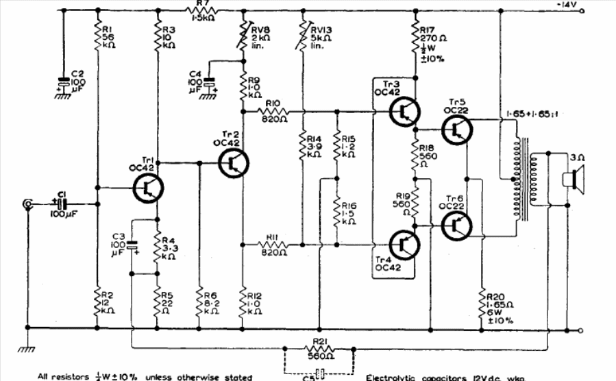 This experimental amplifier was found in the 1960 Mullard transistor reference manual. The critical component, in addition to the transistors, is the output transformer.