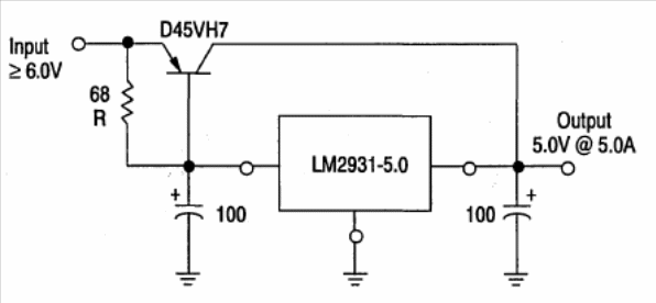 This 5 V regulator has a low voltage drop and can supply currents up to 5 A. The circuit is from Motorola's 1993 Linear Interface ICs. The transistor must be of low conductive resistance type.