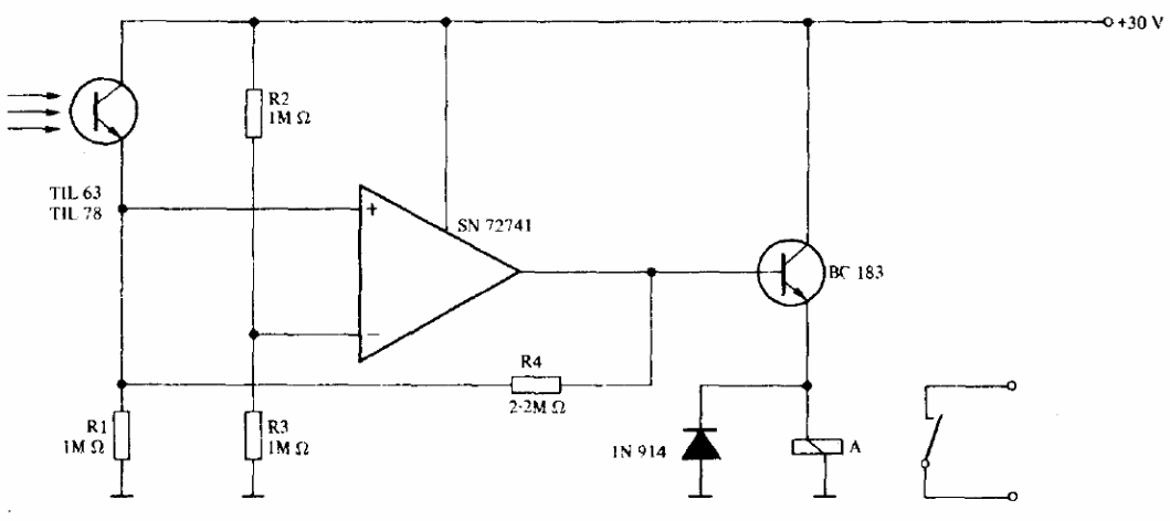 This circuit was found in a Texas Instruments optoelectronics manual and can work with any phototransistor. The transistor can be the BC548 and the supply voltage can be changed according to the relay used. R4 determines the circuit gain.