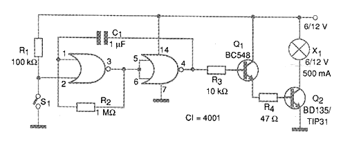 In the figure we show another interesting application for integrated circuit 4001. This circuit causes a lamp to flash, producing flashes in the frequency of 1 Hz, determined by capacitor C1. Lamps up to 500 mA can be controlled with the BD135 transistor and with the use of TIP31 lamps of higher wattages can be used. The power transistor must be mounted on a heat radiator and the power can be supplied with voltages from 6 to 12 V depending on the lamp. An interesting application for this circuit is in automotive signaling. Note that the circuit has a low consumption switch that is used to control it without the need to act directly on the supply. This means that instead of this switch, we can use low consumption sensors as reed-switches in alarm systems. In this case, just replace the lamp with a good audio oscillator, a bell or a relay that activates a powerful system.