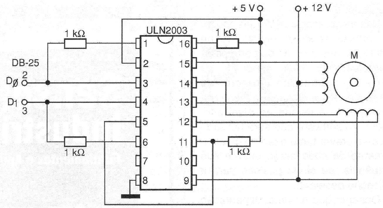 In this case, the maximum current that the ULN2003 integrated circuit can supply is 500 mA per winding. Note that here we have a double power supply that must have 5 V for the internal logic and 12 V for the motor supply. It is important to note that the CI ground on pin 8 must be common to the PC or digital drive circuit and to the 12 V and 5 V circuit.