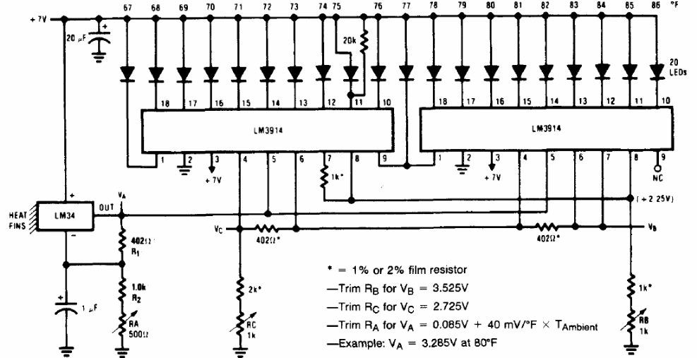 The thermometer presented, for the Fahrenheit scale, is from the Linear Applications Handbook of the National Semiconductor of 1994. The LM34 sensor is not easy to obtain and there is an equivalent for the Celsius scale.