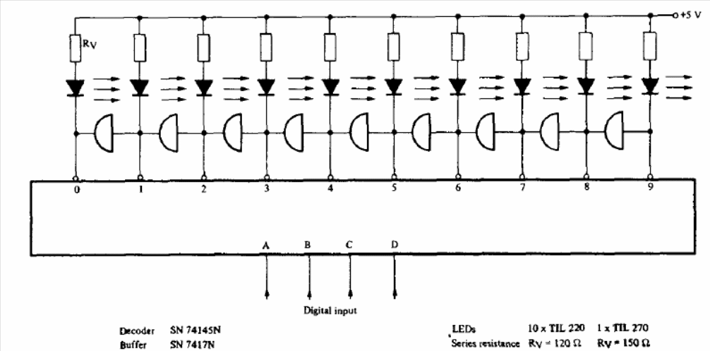 This circuit indicates a digital value through a moving bar. The circuit is TTL and must be powered by 5 V. We find this circuit in a Texas Instruments optoelectronics manual.