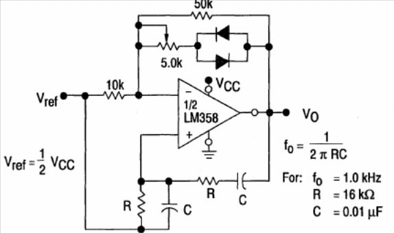 This sinusoidal oscillator was found in the 1993 Linear Interface ICs by Motorola. Other series operators such as the LM258, LM358 or LM2904 can be used. The formula next to the diagram makes it possible to calculate the frequency.