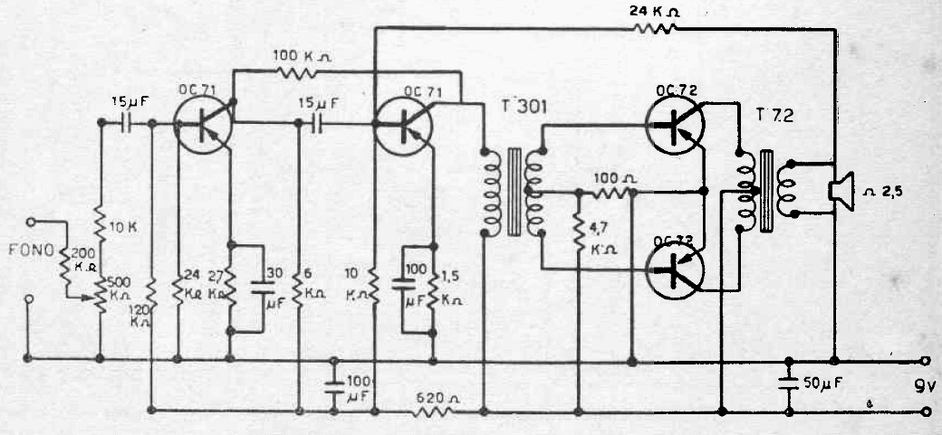 This circuit is from an old Italian publication, being used in record players with crystal capsules and 9 V power. The critical components are transformers that can be obtained from old radios or old amplifiers that are not in use.