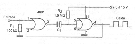 In the figure we show a monostable that uses two of the four ports available on 4001. The duration of the pulse generated at the output when a short pulse is applied at the input depends on the value of capacitor C. This component can have values in the range of 1 nF to 100 uF. The supply can be done with voltages from 3 to 15 V and the output signal is rectangular.