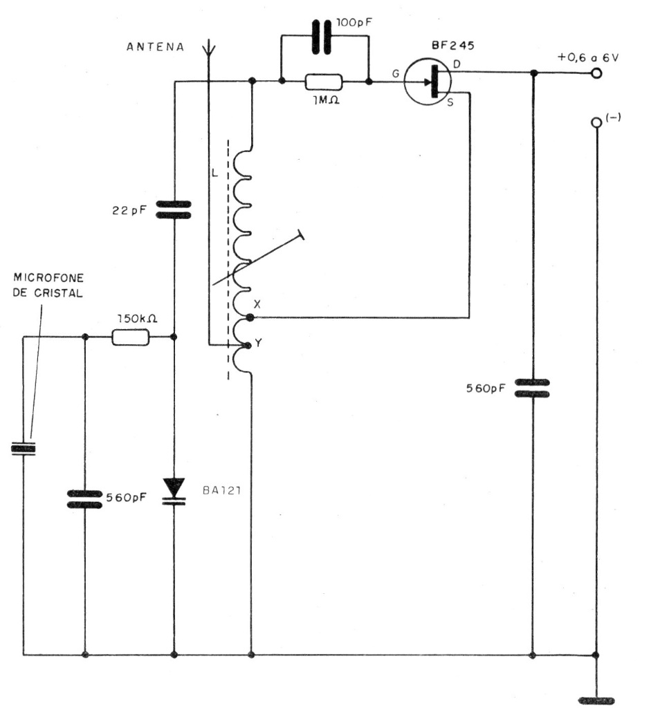 This small FM transmitter uses a common FET to generate signals that can be picked up from a distance of a few tens of meters. The coil consists of 1 + 1 + 4 turns of wire 26 or 28 in the form of a 0.5 cm core. The frequency is adjusted by the movement of the core. Capacitors must be ceramic.