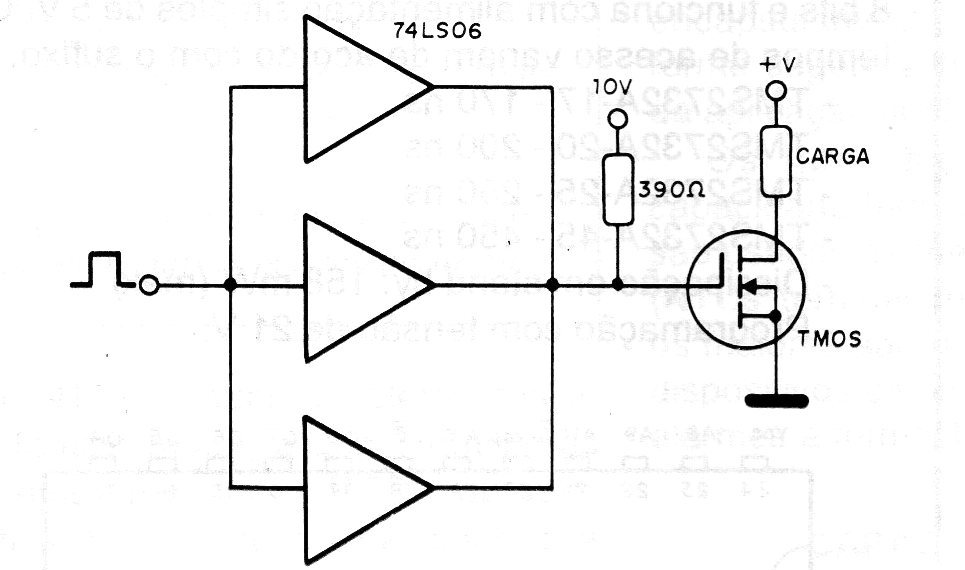 Excitation of power loads with a T-MOS transistor (Motorola) using TTL-LS (Low Power Schottky) logic, must be done as shown in the figure. This circuit has a 45 ns turn-on delay and a 30 ns turn-off delay with a rise time of 30 ns, and a drop time of 140 ns. Power MOS transistors of the lRF series can be used in this circuit to excite loads with up to several amps of current.
