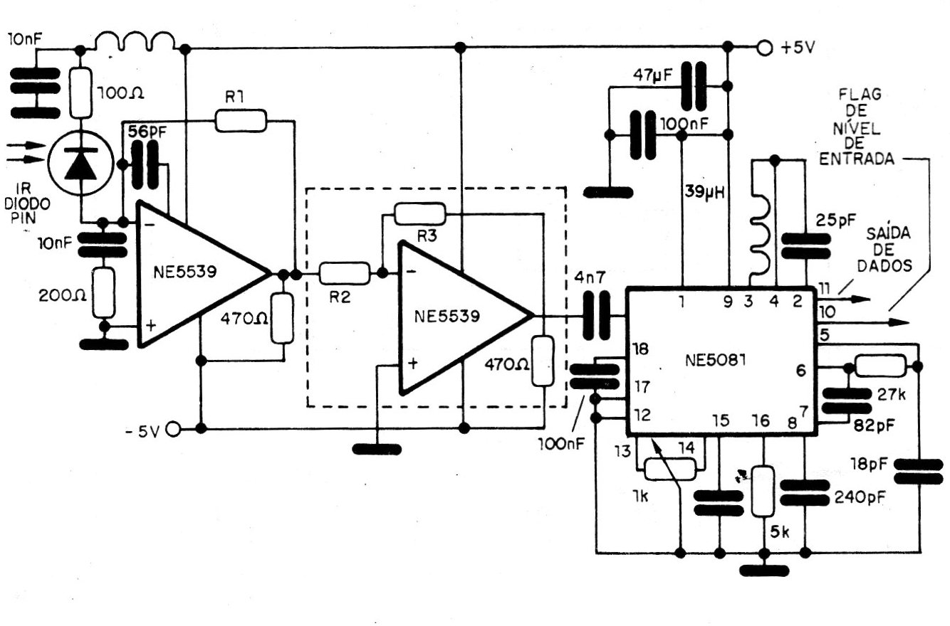This is the receiver circuit for the CB15958E transmitter. Depending on the attenuation obtained in the optical fiber, the circuit gain must be adjusted according to the values of R2 and R3, as well as R1. When assembling, it is recommended that the terminals of the tuning circuit components be kept as short as possible. Signal decoupling shocks are 10 uH in both circuits.