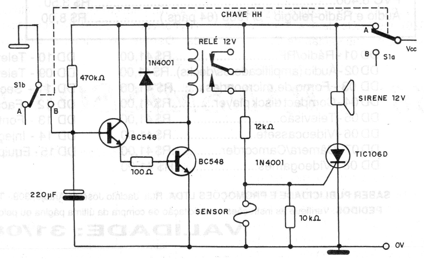 This 1995 circuit uses interruption sensors or NC connected in series in any quantity. With the opening of one of them, the circuit goes off, feeding a 12V siren. The circuit is simple, and the components used are common.