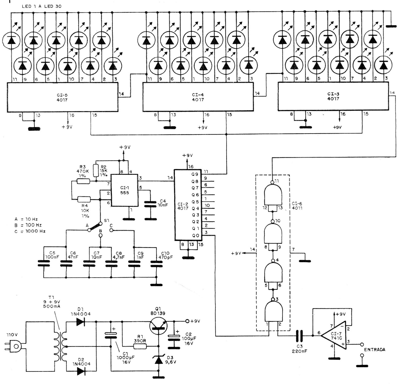 This circuit is from 1988 documentation. It uses a range of 30 LEDs driven by 4017 integrated circuits. The circuit is for audio frequencies from 10 Hz to 1 kHz selected by the switches next to a capacitor bank. The accuracy of the circuit depends on the components of this sector, including the time resistors next to the 555. The circuit is powered by a simple 9 V source.