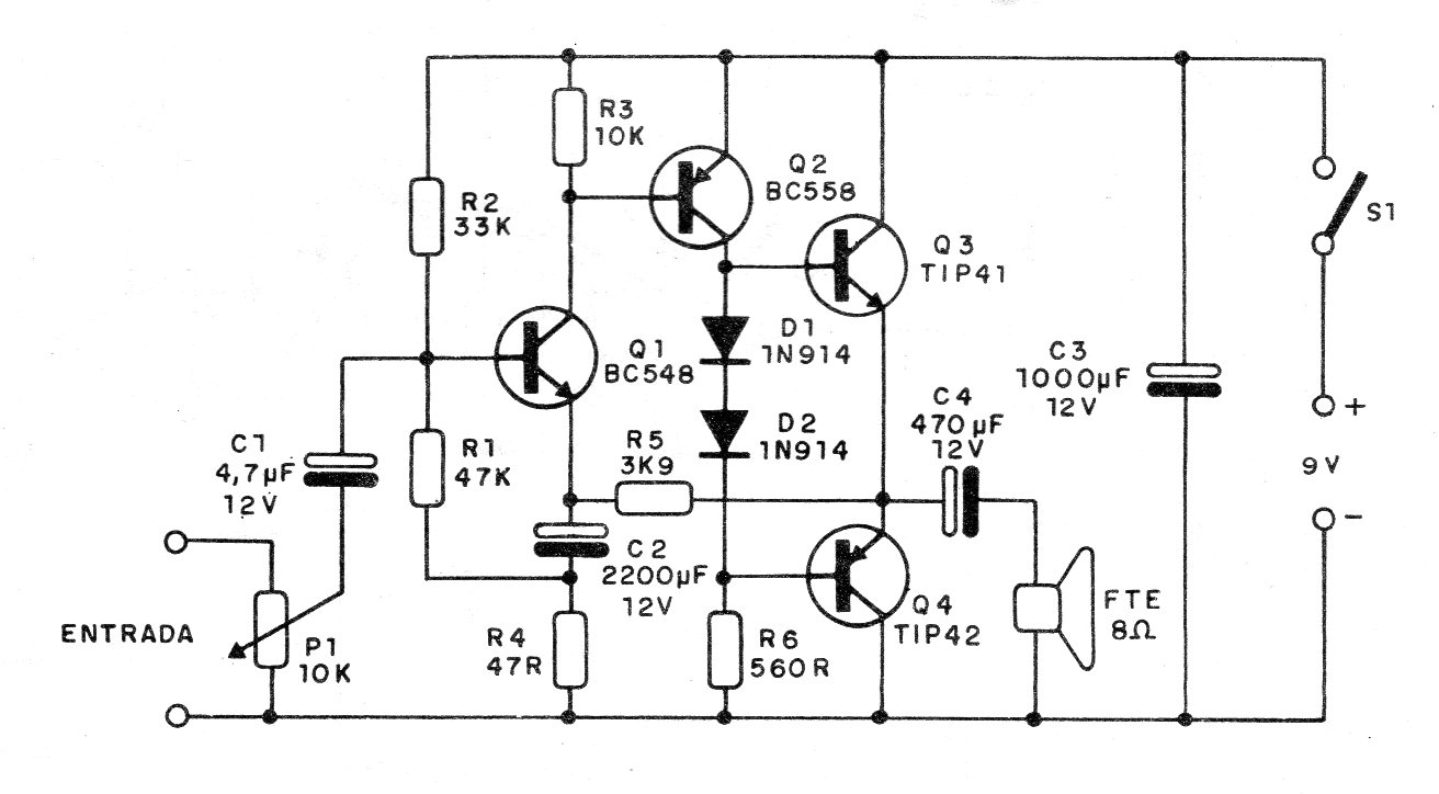 This traditional amplifier with complementary output transistors was found in a publication in 1998. The output transistors must have a heat sink and the source must provide a current of at least 800 mA. The circuit presents excellent fidelity and good input sensitivity.